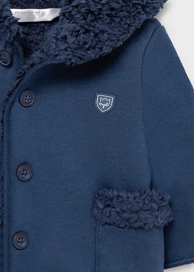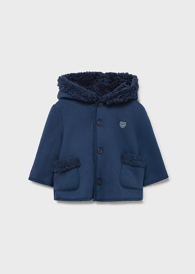 Μπουφάν μακρυμάνικο για Νεογέννητο αγόρι από 0 έως 18 Μηνών. Γιακάς με κουκούλα. Κλείνει με κουμπιά. Φόδρα γουνάκι εσωτερικά.